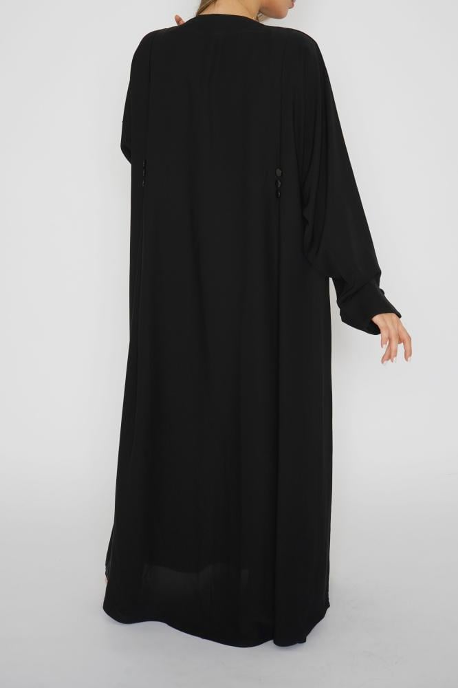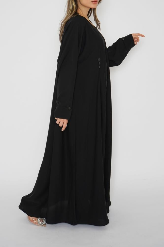 عباية أنيقة باللون الأسود، تتميز بأزرار جذابة تضيف لمسة من الأناقة على الأكمام ومن الأمام. هذه العباية عملية وعصرية، مثالية للاستخدام اليومي أو المناسبات. مصممة لتمنحكِ الراحة والتميز، وتأتي بقفلة طقطق لسهولة الارتداء.