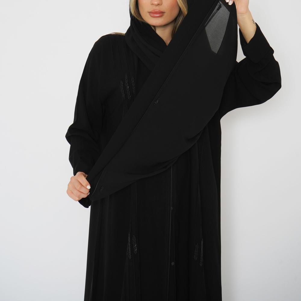 عباية سوداء بكسرات بمسارات طولية مطرزة بقطع كريستال متفرقة