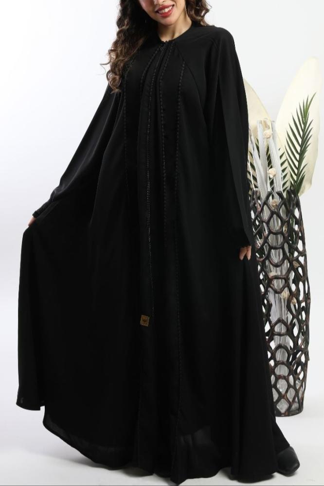 التزيين: قيطان أسود بطول العباية وعلى الأكمام لإضافة لمسة من الجاذبية.