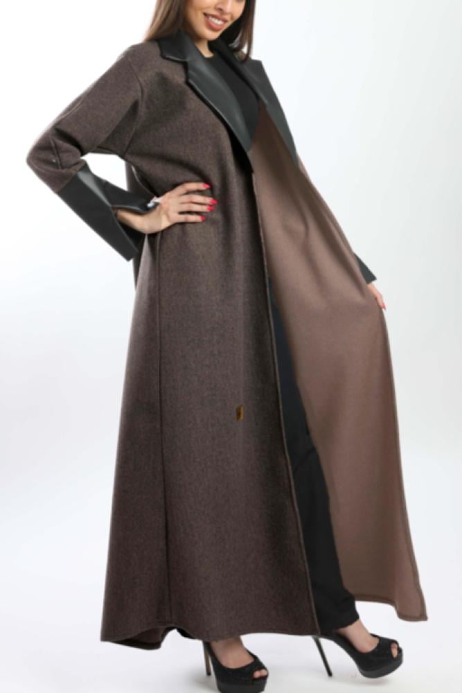عباية شتوية باللون البني جوخ واكمام سوداء من جلد A5065