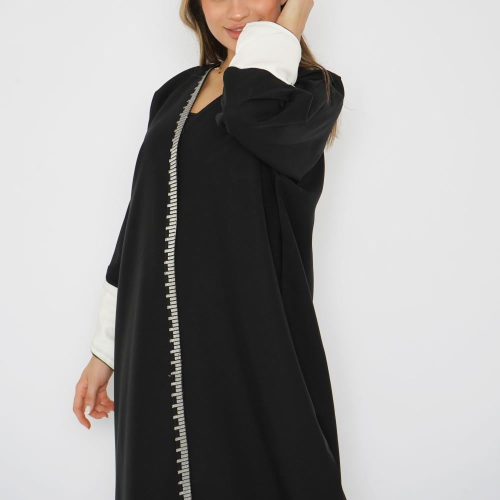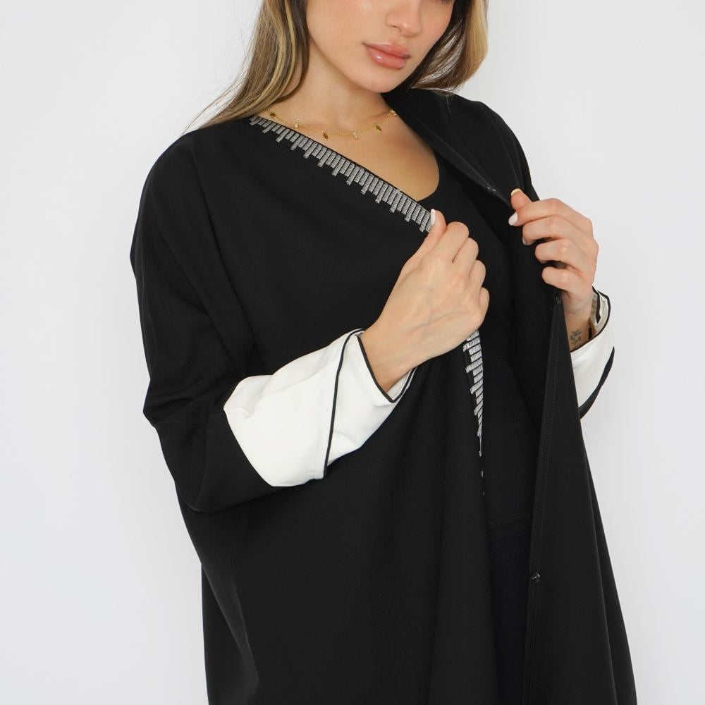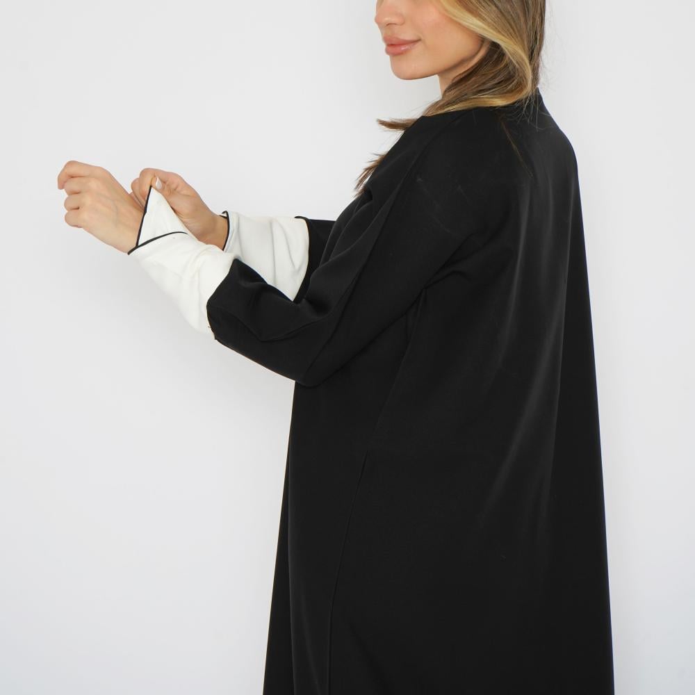 عباية سوداء أنيقة صُممت من قماش الميني ميت عالي الجودة مع تفاصيل قماش الباربي الأبيض، لتضفي لمسة فاخرة وعملية. تتميز بتطريزات راقية بالخيوط البيضاء التي تزين العباية، وتكتمل الفخامة بإضافة الكم القلاب باللون الأبيض الذي يتناسق بشكل مثالي مع التطريز. هذه العباية تجمع بين العملية والجمال، لتناسب جميع مناسباتك الخاصة والعامة.