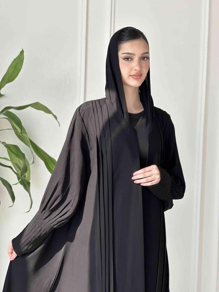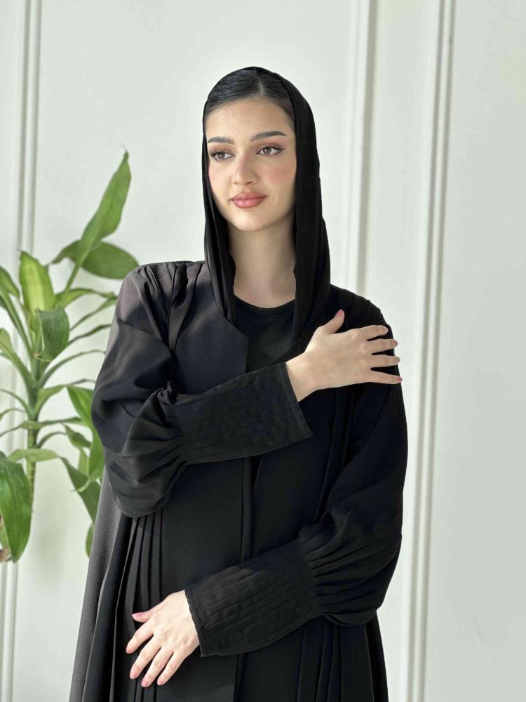 An elegant black abaya made of royal jet black fabric that reflects sophistication and refined taste with a quarter-cloche design for comfort and freedom of movement, and pleats along the length of the abaya and on the sleeves with a wide bracelet that gives the design more luxury and makes it suitable for different tastes and body shapes.