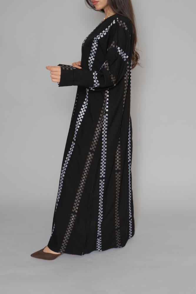 Black abaya embroidered with longitudinal threads in intertwined shapes, white and Galaxy 6058
