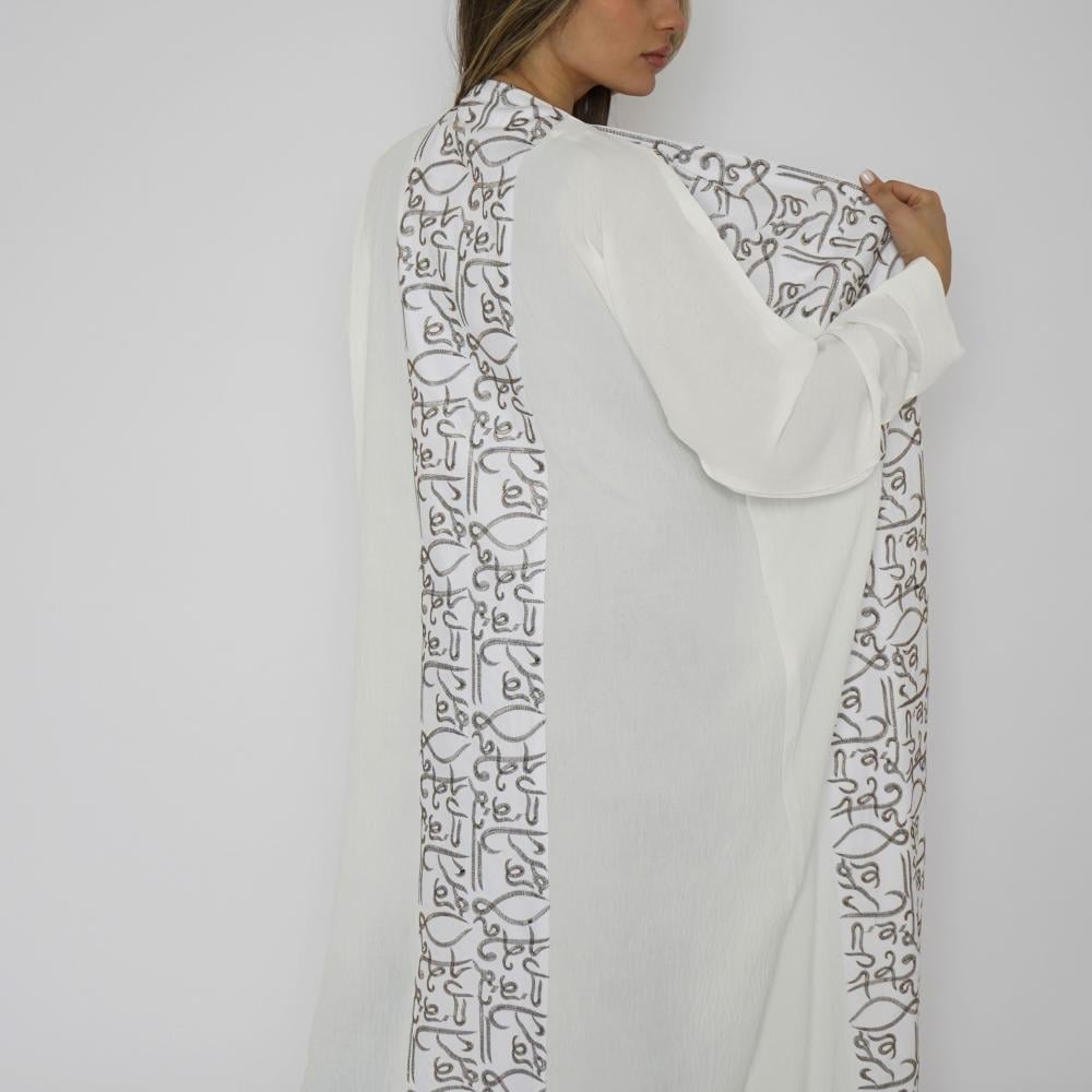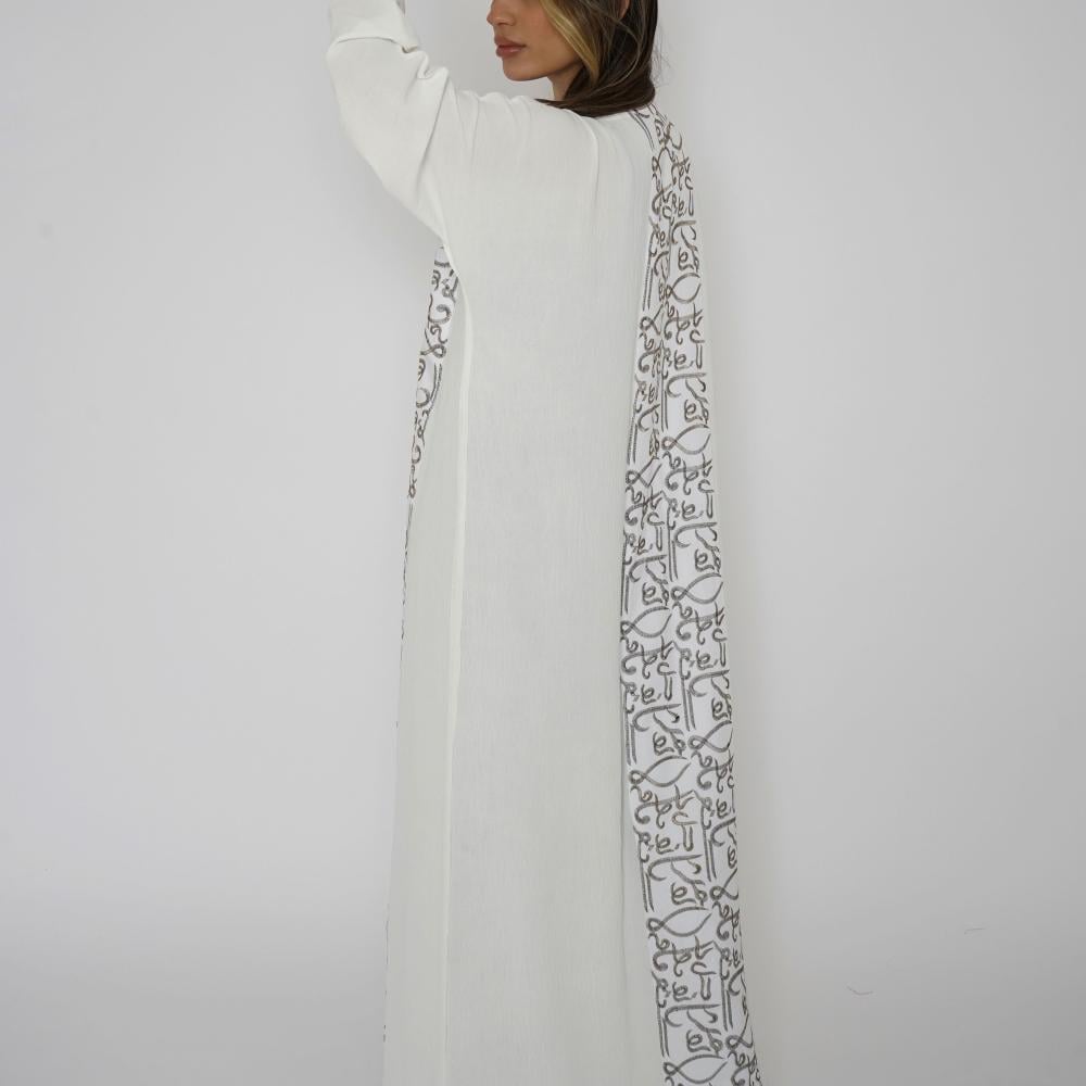 Elegant white shoulder abaya made of cool and practical linen fabric, decorated with embroidery inspired by Arabic letters and Islamic motifs in gold on the front and back. It is distinguished by its flip sleeves, making it an ideal choice for every girl who loves fashion and a modern look to appear different and distinctive every day. This abaya is designed to suit all your private and public occasions.
